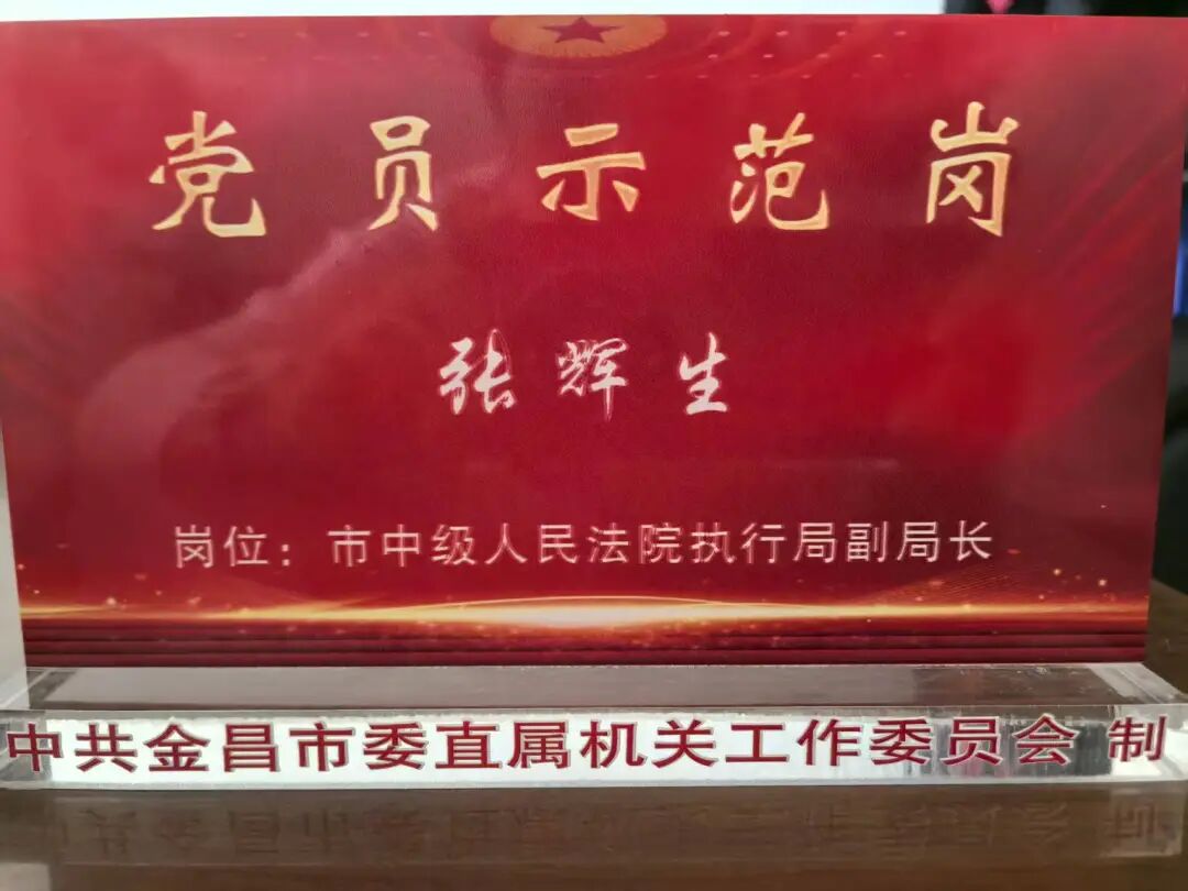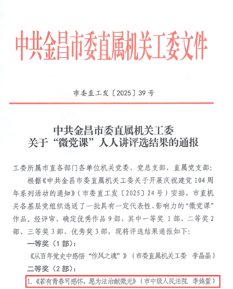 近日,在市委直属机关工委举办的庆祝建党104周年系列活动中,金昌中院报送的“微党课”《若有青春可感怀 愿为法治献微光》荣获二等奖,执行局副局长张辉生所在岗位被评为“市直机关党员示范岗”。