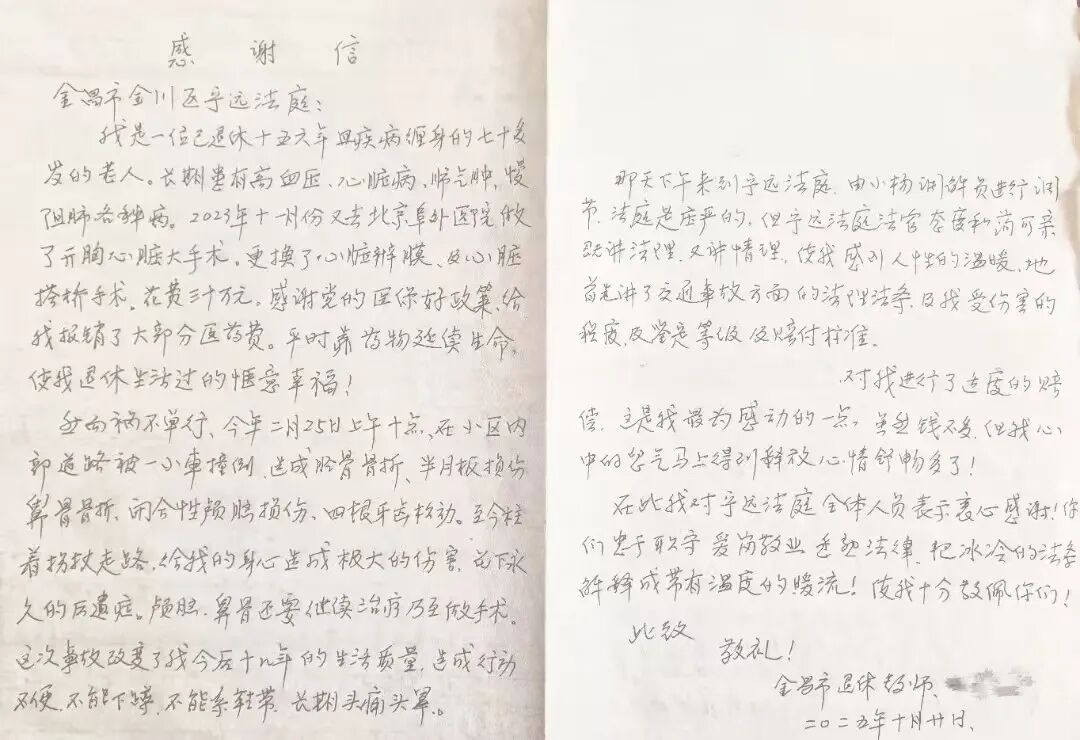 一封笔迹质朴却情真意切的感谢信,被郑重地交到金川区法院宁远堡法庭法官手中。信中,古稀之年的陈大爷写道“在此我对宁远法庭全体人员表示衷心感谢,你们忠于职守,爱岗敬业,熟悉法律,把冰冷的法条解释成带有温度的暖流,使我十分敬佩你们”。一场曾让他倍感无助的纠纷,在宁远堡法庭温情调解下,得以快速圆满化解。