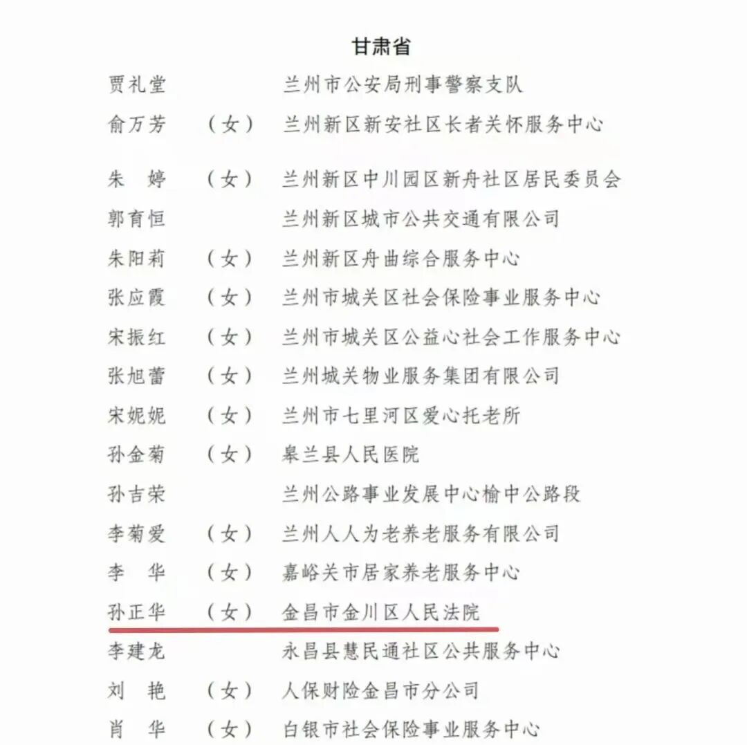 近日,全国老龄工作委员会办公室发布《关于表彰全国“敬老文明号”和全国“敬老爱老助老模范人物”的决定》,金川区人民法院刑事审判庭庭长孙正华被评为全国“敬老爱老助老模范人物”。