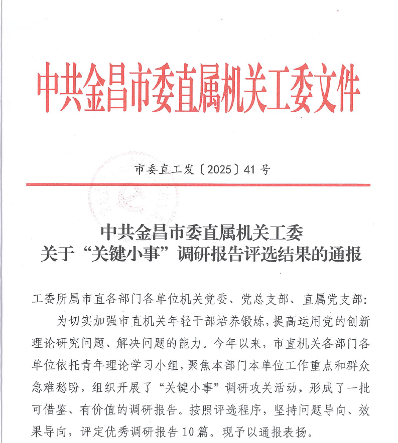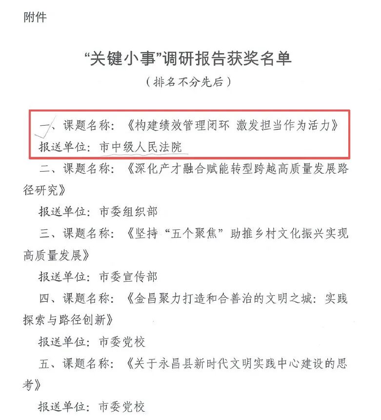 近日,在市委直属机关工委组织开展的“关键小事”调研报告评选活动中,金昌中院干警撰写报送的《构建绩效管理闭环 激发担当作为活力》被评为优秀调研报告。